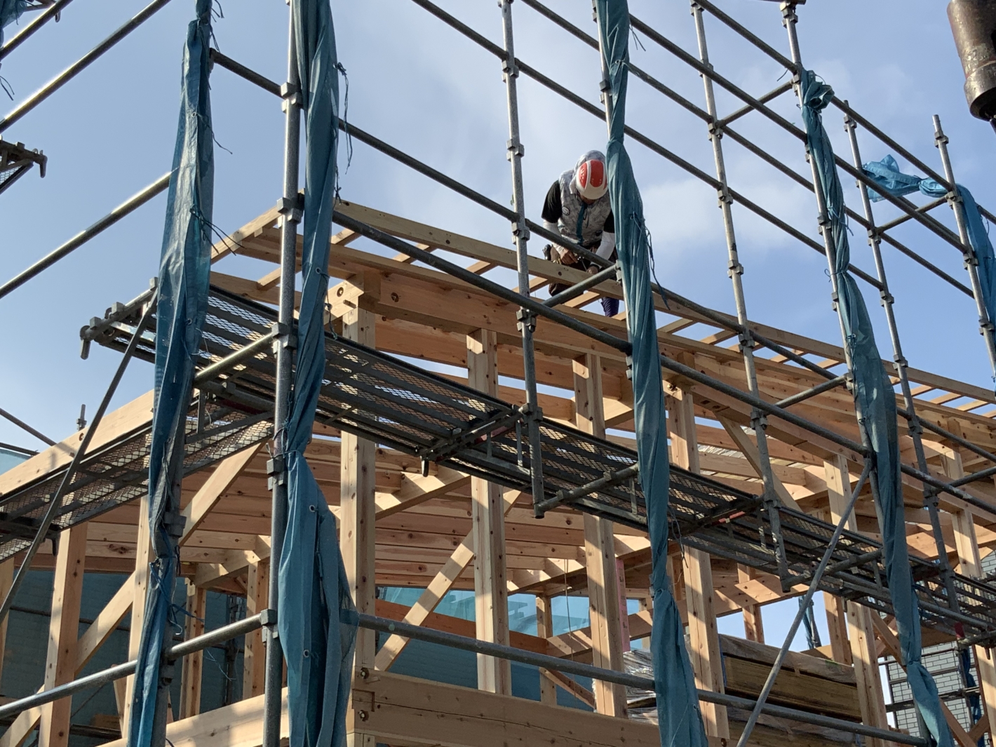 2025年7月上旬、新社屋兼モデルハウスが、ついに上棟を迎えました!当日は、棟梁をはじめ、5人の大工さんたちが集結。息の合ったチームプレーで、流れるように正確に、作業を進めています。