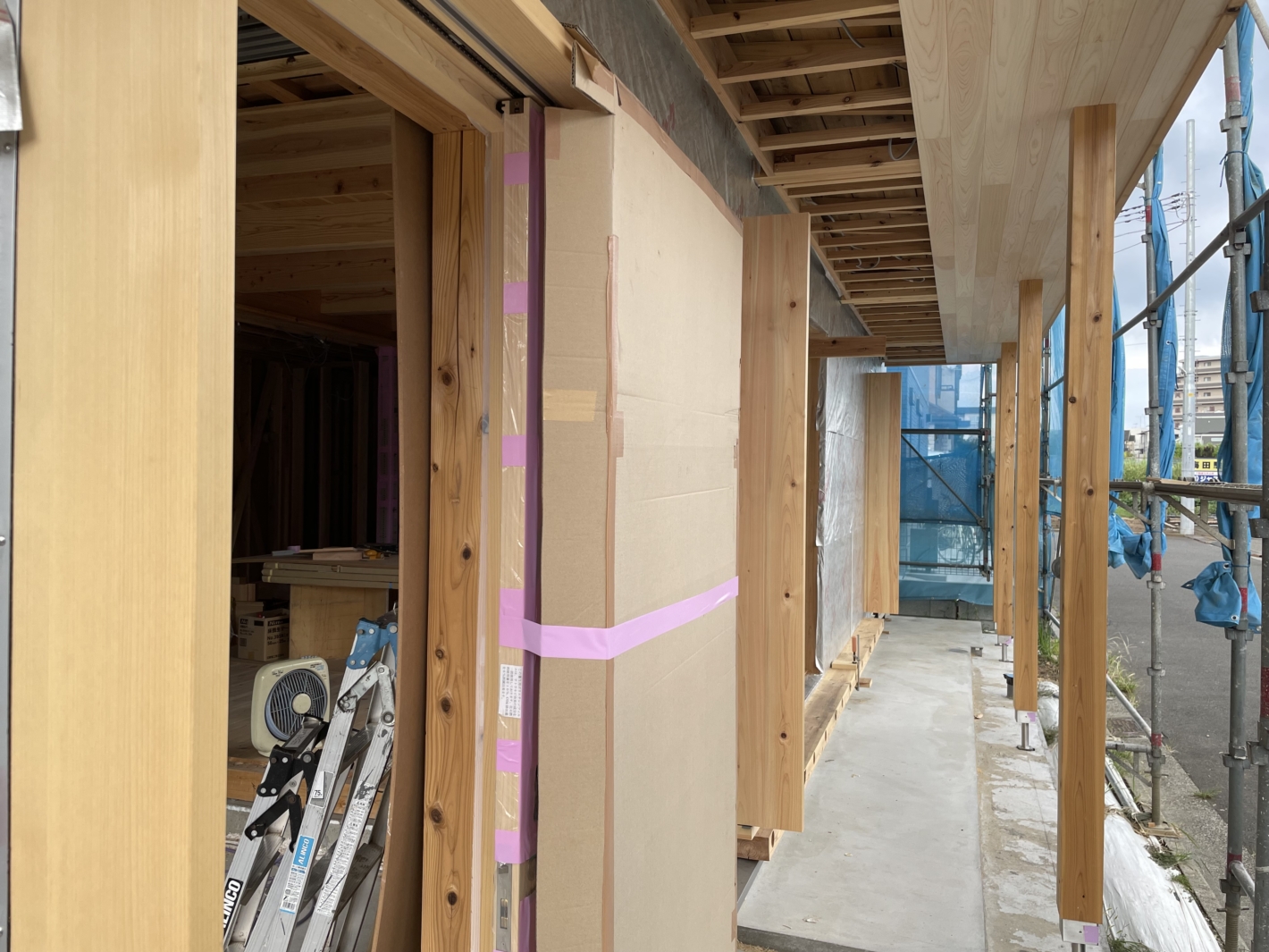 9月中旬、サッシも入り、建物らしい姿になってきました。これから電気工事が始まり、少しずつモデルハウスの形が見えてきます。